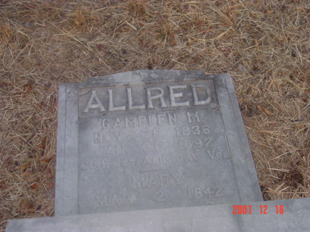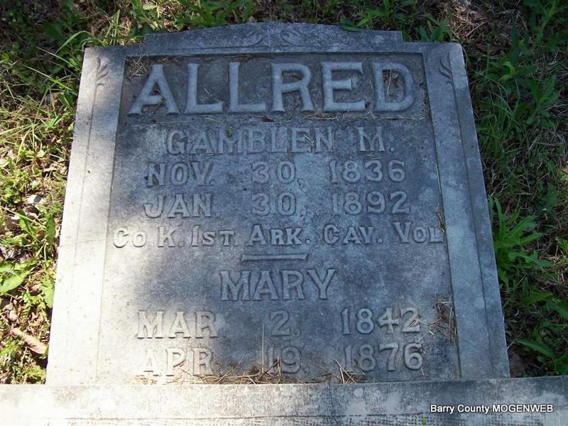 SSW: Mary Allred - Inscription: "Co. K 1st Ark. Cav. Vol." - Research Note:This stone is off its base and flat on the ground - but was repaired during the cleanup. - The 1880 census for Shoal Creek, Barry County, lists Gamblen M. Allred in household #10 - 11, he was age 44, widowed, a farmer born in TN with TN born parents. - Jim's Notes: He was the son of Solomon James Allred and Martha Weeks. - 1850 census of Osage, Carroll Co., AR - lists Gamblen as aged 16, born in TN living with his widowed mother Martha (Weeks) Allred and his siblings. - 1860 census of Kings River, Madison Co., AR - lists Gamblen, age 25, born TN living with wife Mary (Lane). - 1870 census of Shoal Creek, Barry Co., MO - lists Gamblin, age 34, born TN living with wife Mary and their children. - The 1880 census for Shoal Creek, Barry Co., - lists Gamblen M. Allred in household #10 - 11, he was age 44, widowed, a farmer born in TN with TN born parents. - Another Photo - Another Photo | Headstone Roger Longley Note Donna Cooper Note Jim Allred Photo Darla Marbut Photo Ted Roller |