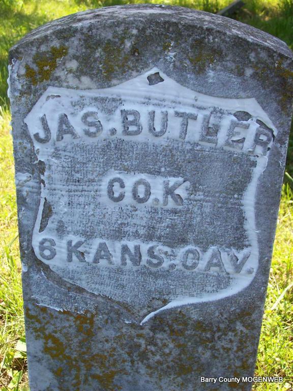 Inscription: "Co. K. 8 Kans. Cav." - Research Note: James J. Butler first married Winnie Whiteley, they had two children, Mary Elizabeth, born 1851 in Arkansas and James Columbus, born 1855 in Barry Co., Missouri. Winnie died when James was an infant. He second married Eliza J. Smith on Dec. 17, 1857 in Lawrence Co., MO. They had Willie J., Sarah L., Charles M., and Rosetta. Eliza is buried at Muncie Chapel Cemetery. Following are affadavits for Eliza'a Civil War Pension: Pension Application for James J. Butler - General Affadavit: In the matter of claim for Eliza J. Butler widow of James J.; K 6th Kansas Cavalry, Lucy Tuggle whose age is 66 years, Residence and Post Office Grangeville, Newton Co., Missouri. Declares: I was acquainted with James J. Butler. Previous to his first and second marriage. His first wife died about 2 years before his marriage to Eliza J. Smith. I was present on the occasion of her death, as well as I remember his first wife died in the year 1855. - General Affadavit - State Of Missouri, County of Barry, Dr. R. B. Archibald, 38 years old, residence Purdy, Barry Co., Missouri, I will state that on the 13th day of April 1879, I was called to see James J. Butler and found him in the last stage of pulmonary phthisis or consumption. Was asked again on April 15th 1879 and found Mr. James J. Butler dying. He died in about one hour after I arrived on the 15th of April 1879. - Affadavit of Lydia M. Briscoe - James Butler came to my house on his way home from the army about the last of March 1865. He was not complaining of anything excepting a bad cough. Some times he was better, some times worse. The longest period of not seeing him after he came home was about three or four years. He worked nearly all the time to within a year of his death. - General Affadavit, State of Missouri, County of Barry, of J. H. Davis who is thirty four years old whose Post Office address is Corsicana, Barry Co., Missouri. - I was acquainted with J. J. Butler for a period of about five years prior to his death. I first became acquainted with him in February 1874 at Joplin, Jasper Co., MO. He employed me to work on his place a short time as he was sick. He had a cough during that time and complained of lung trouble contracted in the army and he said this was his difficulty or disease so long as I knew him. He was laboring in the Jasper lead mines. He resumed work in about two or three weeks. Then for a period of ten months I boarded with him. - J. H. Davis was the son-in-law of Eliza. He was married to her daughter, Charlotte "Lottie". | Headstone Roger Longley Note Peggy Seidler Photo Darla Marbut |