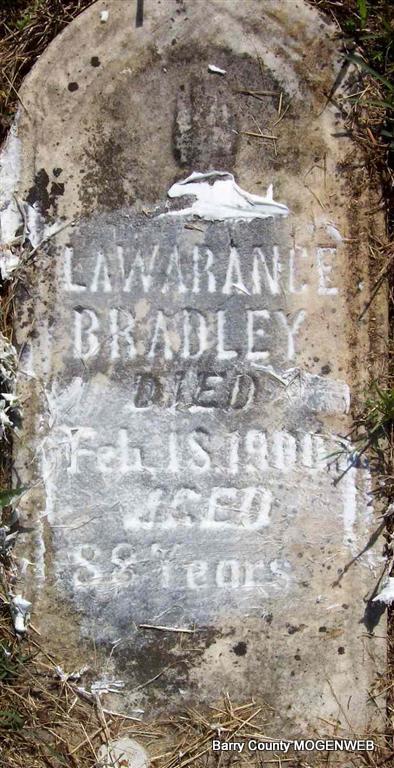 Inscription: "Aged 88 Years" - Research Note: This stone is broken off from its base and needs repair. Donna's Note: Lawrence Bradley was probably born about 1812. He had two wives - the first was Sarah Green and they married in TN, and the second was Janette Woodward and he married her in Barry County on Dec. 18, 1870. | Photo Darla Marbut Note Donna Cooper |