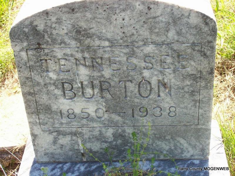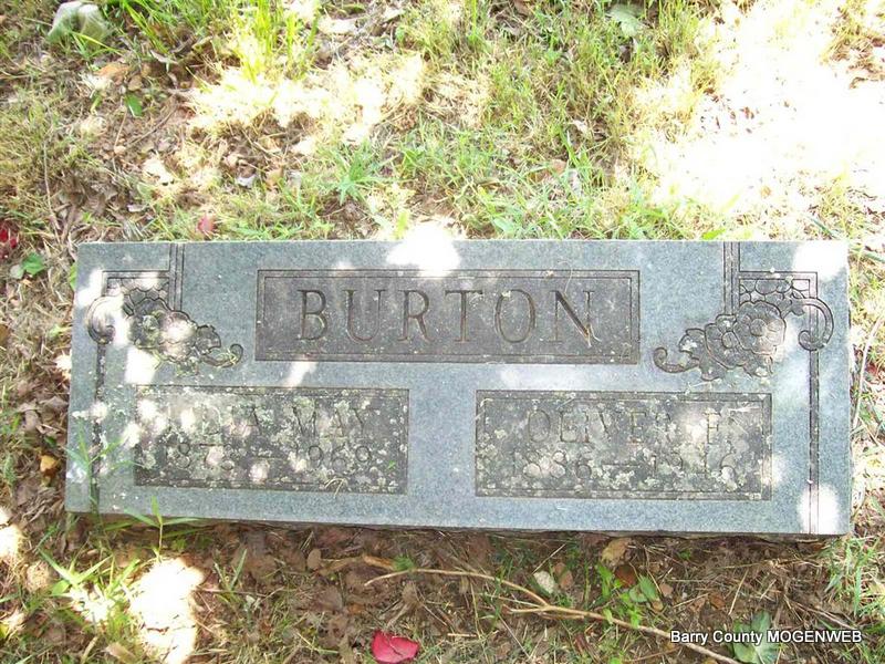 Research Note: Posted here was a birth date of June 1868 by Anna Poore. Oliver's death certificate gives his birth date as June 25, 1866. She also posted Feb. 1946 as his death date, but his death certificate gives March 6, 1946 as the date of his death. His father was given as (William)Jessie Burton and his mother as (Cynthia) Angeline Bradley, both born in TN. Liddy May Burton was given as his wife's name. Floyd Burton, Purdy, MO, was the informant. | Note Anna Burton Poore Headstone Mary Homesley Death Certificate Donna Cooper Photo Darla Marbut |