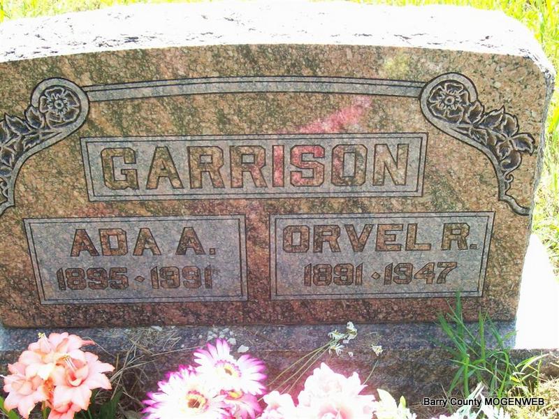 | GARRISON, Ada Ann (SANTEE) | 1895 | 1991 | SSW: Orvel R. - Research Note: Ada Santee, age 19, married Orvel Garrison, age 22, on Aug. 9, 1914 in Wheaton, Barry Co., MO. Daughter of John Leonard Santee and Viola Leona "Ollie" Patton. | Headstone Roger Longley MO Marriage Records Census Phyllis Long Photo Darla Marbut |