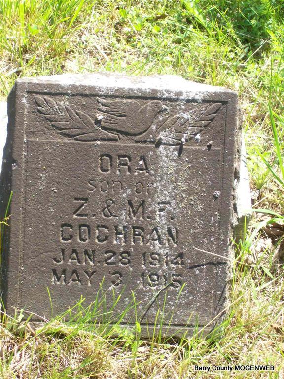 | COCHRAN, Ora | Jan. 28, 1914 | May 3, 1915 | Inscription: "Son of Z. & M. F. Cochran" | Headstone Roger Longley Photo Darla Marbut |