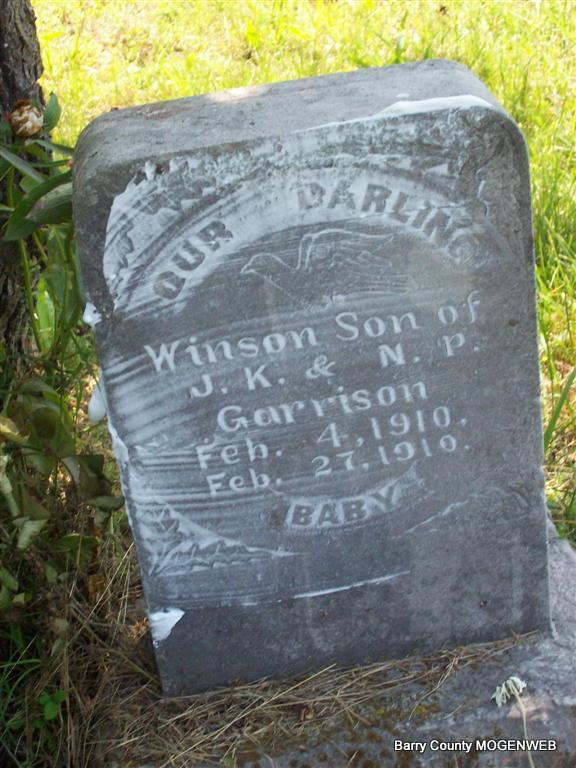 | GARRISON, Winson | Feb. 4, 1910 | Feb. 27, 1910 | Inscription: "Our Darling Winson son of J. K. & N. P. Garrison" - Research Note: Son of James Knox Garrison and Nora Pearl Howerton. Newspaper account gives name as Wilson. - March 3, 1910, Cassville Republican - Wilson, infant son of Mr. and Mrs. Knox Garrison of Shoal Creek, died Feb. 26th. Interment was made at the Clark Cemetery, Sunday. | Headstone Roger Longley Online Newspaper Donna Cooper Photo Darla Marbut |