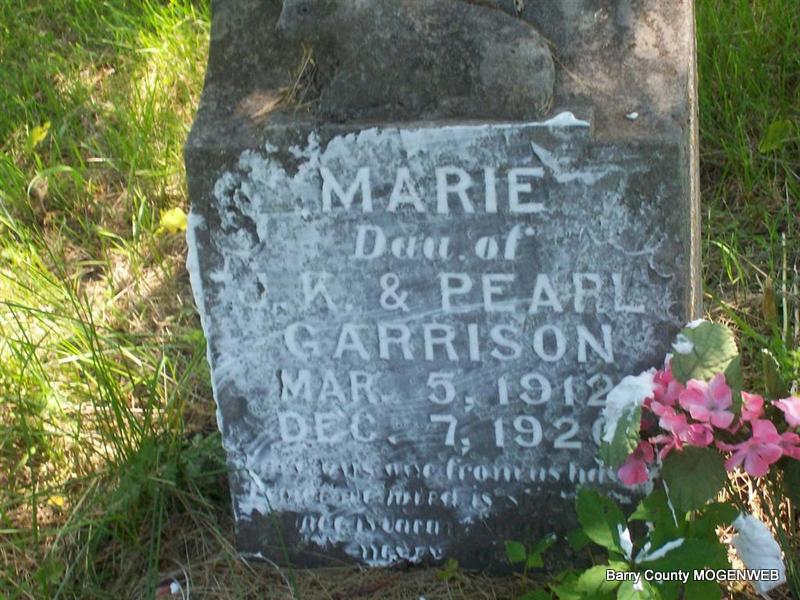 | GARRISON, Marie | Mar. 5, 1912 | Dec. 7, 1920 | Inscription: "Dau. of J. K. & Pearl Garrison" - Research Note: Wheaton Journal, Local News, Dec. 11, 1920 - Mary Marie, 8 year old daughter of Mr. and Mrs. J. K. Garrison died Tuesday, Dec. 7, 1920, diphtheria. Funeral services were conducted Wednesday at the Clark School house and interment made in the cemetery near by. | Headstone Roger Longley Wheaton Journal Donna Cooper Photo Darla Marbut |