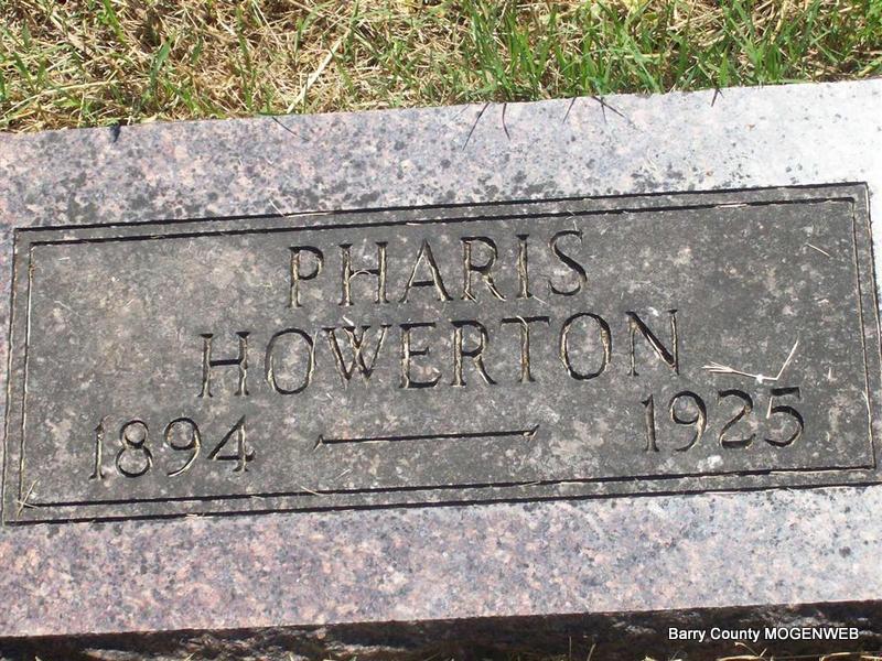 Research Note: Pharis Alexander Howerton was the husband of Lillie Viola Ellis and the son of John Alexander & Mary A. (Stephens) Howerton. - July 16, 1914, Cassville Republican - Licenses to Wed: Pharis Howerton, 21, Purdy and Lillie Ellis, 17, Exeter. | Headstone Note DC Howerton Online Newspapers Phyllis Long Photo Darla Marbut |