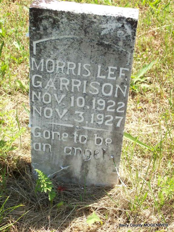 Inscription: "Gone to be an angel - "Research Note: Morris Lee Garrison was the son of William Alonzo Garrison and Effie Packwood. | Headstone Note DC Howerton Photo Darla Marbut |