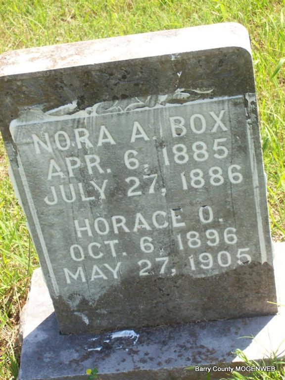 | BOX, Nora A. | Apr. 6, 1885 | July 27, 1886 | SSW: Horace O. - Research Note: Daughter of Dallas A. Box and Martha C. Higgs. - Another Photo | Note Phyllis Long Photo Mary Homesley Photos Darla Marbut |