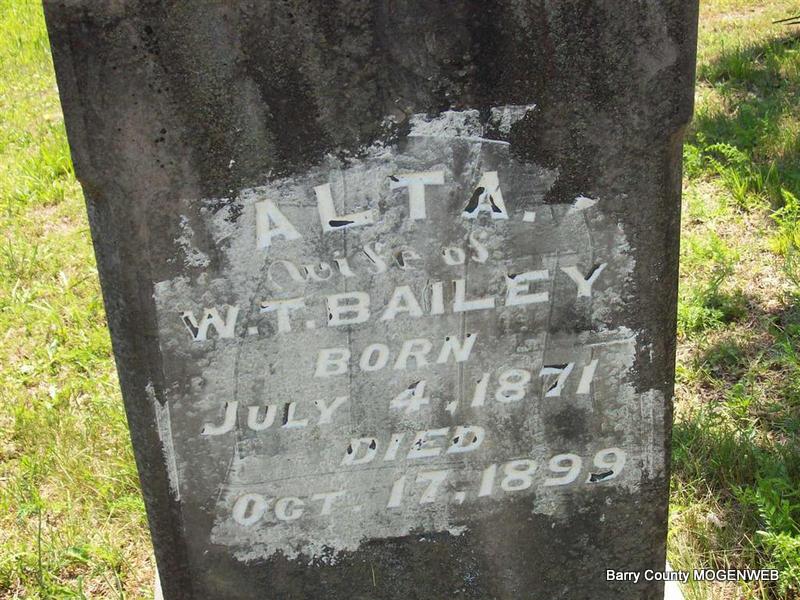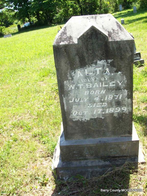 Inscription: "Wife of W. T. Bailey" - Research Note: Oct. 26, 1899, Cassville Republican - Died at her home in Corsicana, Tuesday morning Oct. 17, 1899, Alta, wife of Dr. W. T. Bailey, age 29 years from inflammation of the stomach and heart trouble. She was the second daughter of J. C. Jeffries. - Dr. William T. Bailey was the county physician served in WW I as a Captain and as a doctor. He is buried at Oak Hill Cemetery with his second wife Lela Amelia Johnson. - Alta Jeffries, age 21, married William T. Bailey, age 24, in Cassville, Barry Co., MO. Daughter of James Calvin Jeffries and Sarah Luvena Huffacre. - Another Photo | Headstone Roger Longley Online Obit MO Marriage Records Census Phyllis Long Photos Darla Marbut |