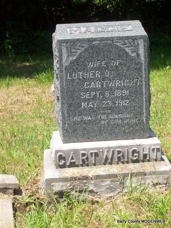 Inscription: "Wife of Luther O. Cartwright - She Was The Sunshine Of Our Home" - Research Note: Cassville Republican, May 30, 1912 - Mrs. Margaret Susan Cartwright departed this life, May 23rd, 1912 at her home near Wheaton, MO. Maggie as she was familiarly known is the daughter of Halbeck Rhea and wife of near Clark. She was 20 years, 8 months and 15 days old and a bride of only two weeks when the summons came, having been married to Luther O. Cartwright on May 12, 1912. Funeral services were held at the home of her parents, May 25, conducted by Rev. Siler of Neosho after which her remains were laid to rest in the Clark Cemetery witnessed by a large assembly of people. She was saved at the age of 14 years and united with the Baptist Church at New Hope, where she lived a consistent Christian life or more properly speaking a spotless life of purity. It can be said of her, "She hath done what she could". Maggie had been in poor health for some time but was cheerful and hopeful and scarcely anyone was expecting her departure so soon but this only brings the old saying to mind, "To day we are basking in the balmy summer of life but next finds us silent in the chilly winter of death." - Luther O. Cartwright, age 24, married Maggie Rhea, age 20, on May 12, 1912 in Barry Co., MO. Luther second married Lenah Duncan in 1914 and is buried with her at Chitwood Cemetery. | Online Obit Headstone Roger Longley Online Newspapers Donna Cooper MO Marriage Records Phyllis Long Photo Darla Marbut |
