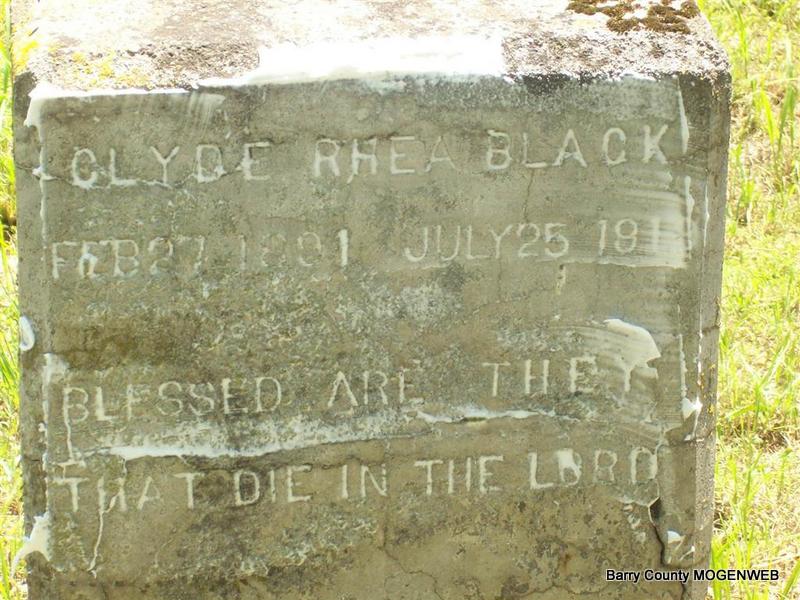 Inscription: "Blessed Are They That Die in the Lord" - Research Note: His death certificate names Henry Black, born in MO, as his father and Miranda Ray, born in TN, as his mother. He was age 22 yrs, 4 mos. and 28 days old at this death. The cause of death was listed as typhoid fever. Miranda Black, Purdy, MO, was the informant. - Cassville Republican, July 31, 1913 - Died at his home five miles south west of Purdy, Clyde Black, son of Henry and Amanda Black, after an illness of 48 days of intense suffering with typhoid fever, which he bore with the greatest patience and was never heard to murmur or complain but was often heard "praising God for the salivation of his soul and how sweet it was to know that he was saved." Clyde Black was born Feb. 27, 1891 and died July 25, 1913, age 22 years, 4 months and 28 days. He was married to Hermin Plancheon of Powell, Feb. 28, 1912. He professed faith in Christ and joined the Protestant Methodist Church in Oct. 1900. All was done for him that could be done by relatives and friends and by Dr. Kelley and F. A. Archibald of Purdy. But it pleased God to take him and we should not grieve as those who have no home but prepare to meet him where parting will be no more. He leaves a wife and one child, father and mother, five brothers and two sisters, two sisters and one brother having proceeded him. His remains were laid to rest in the Clark Cemetery after funeral services conducted by Bro. Goodnight in the presence of a large congregation of people. | Headstone Roger Longley Online Obit Death Certificate Donna Cooper Photo Darla Marbut |