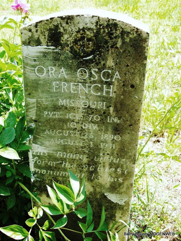 SSW: Ruby French - Inscription: "His many virtues form the noblest monument to his memory" - Military Stone - Inscription: "Missouri - PVT 1 CL. 70 INF. 10 DIV." - Research Note: Stone has born Aug. 26, 1890, died Aug. 1, 1931. Military stone has Aug. 26, 1890 and Aug. 3, 1931. Death certificate has born Aug. 26, 1890 and died Aug. 3, 1931. Son of J. H. French and Anna Smallwood. His wife, Ruby, was the informant on the death certificate. Typhoid fever was the cause of death. | Headstone Roger Longley Note Donna Cooper Death Certificate Phyllis Long Photos Darla Marbut |