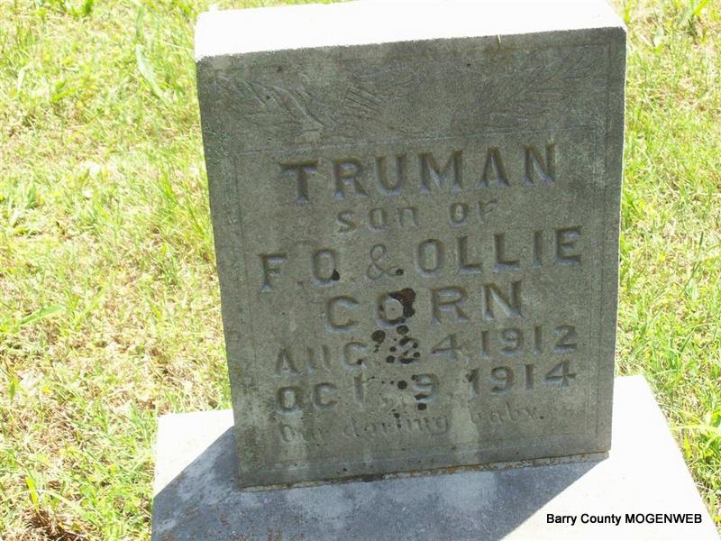 | CORN, Truman | Aug. 24, 1912 | Oct. 9, 1914 | Inscription: "Son of F. O. & Ollie Corn" - Research Note: Son of Fred O. Corn and Mary Ollie Reed. | Headstone Roger Longley Note Phyllis Long Photo Darla Marbut |