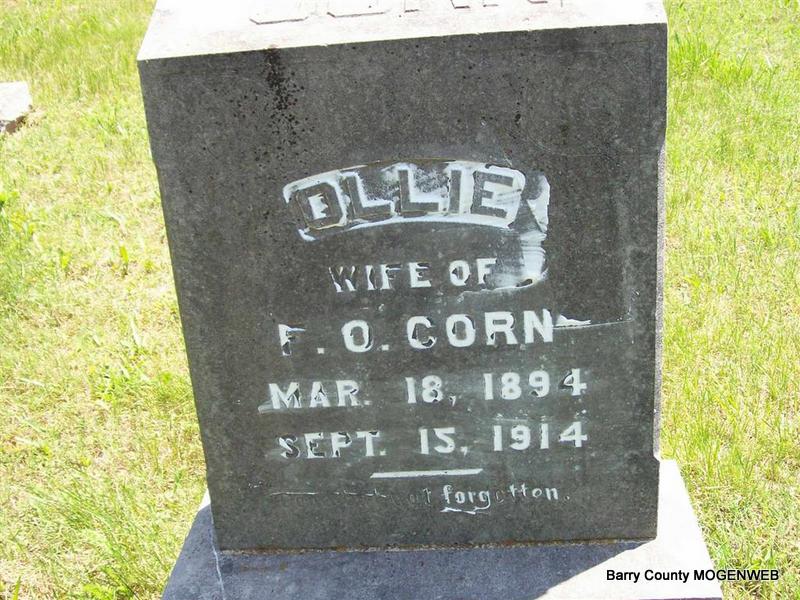 | CORN, Ollie Mary (REED) | Mar. 18, 1894 | Sept. 15, 1914 | Inscription: "Wife of F. O. Corn - Gone But Not Forgotten" - Research Note: Her death certificate reads she died of typhoid fever but does not list her parents' names. Phyllis Long noted that there is very little information on the death certificate. No informant. Cause of death was typhoid fever. Buried at New Church/Mt. Pleasant is wrong. - Ollie Reed, age 17, married Fred O. Corn, age 21 on Sept. 10, 1911 in Barry Co., MO. George S. Reed, father of Ollie Reed, consented to the marriage. Her mother was Mary Ellen Haynes. | Headstone Roger Longley Death Certificate MO Marriage Records Census Phyllis Long Photo Darla Marbut |