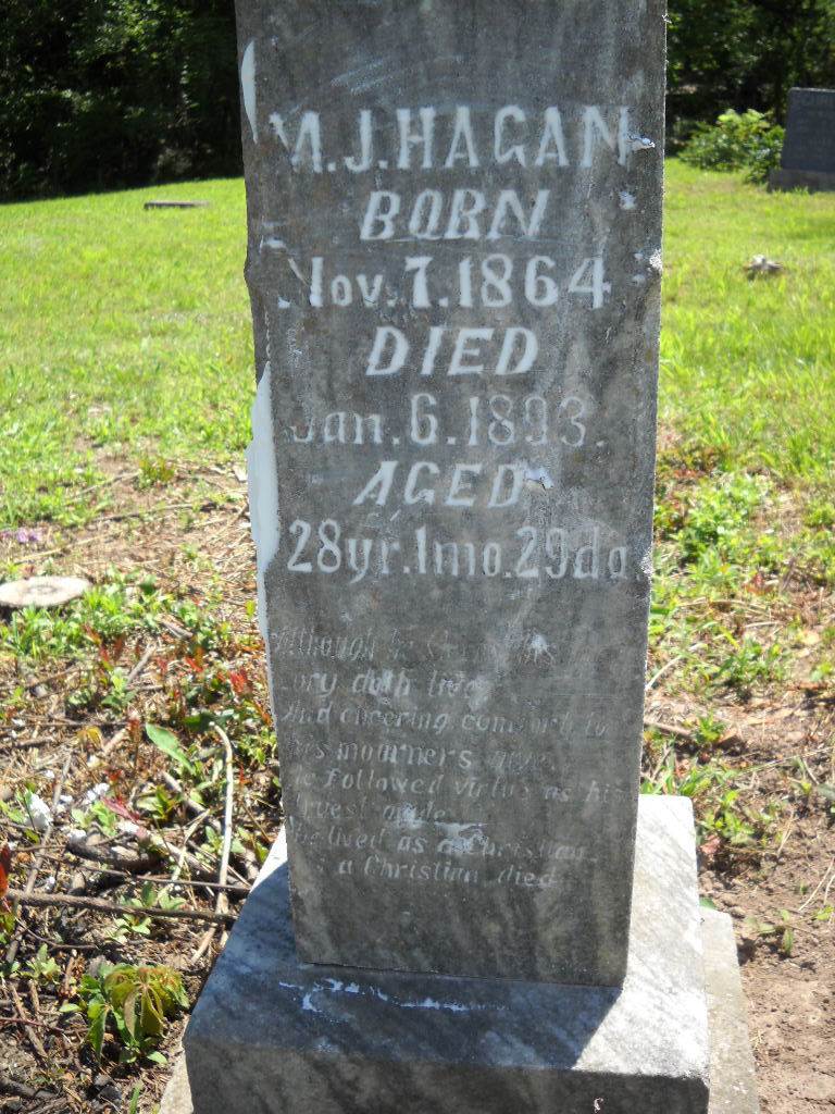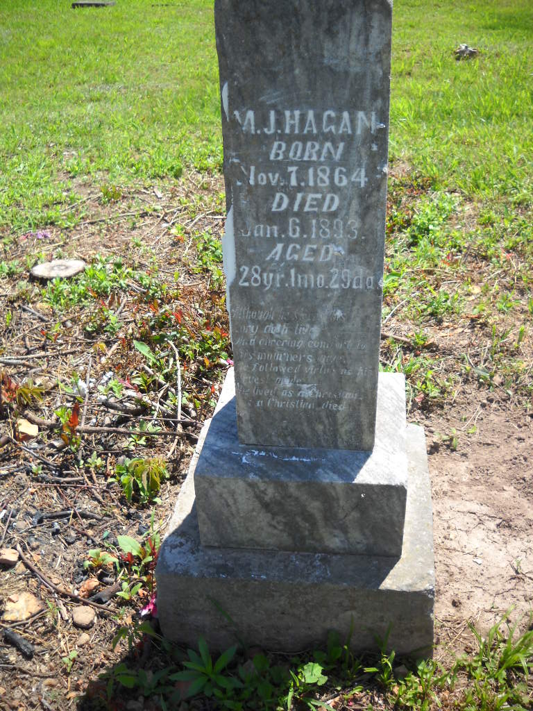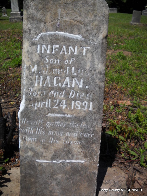 | HAGAN, Infant | Apr. 24, 1891 | Apr. 24, 1891 | Inscription: "Son of M. J. & Lucy" | Photos Darla Marbut |