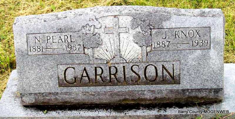 SSW: N. Pearl Garrison - Research Note: Knox served as Justice of the Peace in Barry County. Son of John R. Garrison and Sarah Jane Davidson. - Wheaton Journal, May 4, 1939 - J. K Garrison Takes Own Life - The people of this territory were shocked Saturday afternoon to learn of the death of J. K. Garrison, highly respected and well known farmer, residing east of Wheaton, who committed suicide shortly after noon by shooting himself with a shot gun. Mrs. Garrison and daughter Naydene, got ready to come to Wheaton directly after noon Saturday and Mr. Garrison intended to come with them but as they were about ready to get in the car Mr. Garrison said he believed he would stay around home and asked them to go on without him. Mrs. Garrison and daughter returned home about four o'clock and started to put some feed in the crib at the barn and discovered the body of Mr. Garrison lying on the crib floor. He had been dead for some time and it is thought he ended his life shortly after his wife and daughter left home. He placed the muzzle of the gun at his stomach and the charge ranged upward to his heart. Death was instantaneous. Mr. Garrison suffered a stroke of paralysis some time ago and had not been getting along very well, although he was able to be up and around. He had been despondent for some time and had intimated that he might end his life. He had hid the gun that he ended his life with and the family was unable to locate it. It is thought that he had the gun hid under the crib. Mr. Garrison would have been 62 years old, had believed the 7th of May, and spent his entire life within a quarter of a mile of his birth place. The place where he died was a part of his father’s 500 acre farm which he inherited. His father was the late John R. Garrison, who passed away over 51 years ago when Knox was 10 years old. John R. was the father of eight children; the eldest being 14 years old and the youngest unborn when he passed away. His wife reared the eight children and Knox was the first one to pass away. Mr. Garrison had many friends over Barry County, having been Judge of County Court of Barry County for the Western District two terms. He is survived by his widow, five children, Mrs. Effie Graber of Oregon, Ina of California, Mrs. Veva Hopkins of Washburn, Hubert of Purdy route and Naydene, at home, his aged mother, Mrs. Sarah Overton, who makes her home with a daughter, Mrs. O. E. Foster, of Wheaton, four brothers, Elmer, of Salem, Oregon, Chart of Purdy route, Ira of Monett, Lon of Exeter, and three sisters, Mrs. Cora Brattin, east of Wheaton, Mrs. Lizzie Foster of Wheaton and Mrs. Zula Higgs east of Wheaton, in addition to many other relatives and friends. | Headstone Note DC Howerton Photo Darla Marbut |