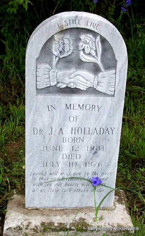 July 10, 1876 | Inscription: "In Memory of Dr. J. A. Holladay - Soon I will meet you by the river in the sweet celestial land and with joy our hearts will quiver as we clasp each others hands." - Research Note: Son of Sanford Holladay and Margaret Sherrill. His wife was Dazrean St. Clair. Dazrean second married George E. Loop. She third married at age 49 to Robert E. Osborn, age 67 in Pierce City, Lawrence Co., MO and went to CA. - Cassville Democrat - Historical Facts - April 13, 1907 - July 10, 1876, Dr. Holladay was arrested on a criminal charge by Bud Crawford. They started to the Doctor's residence, and nearing it, Crawford called to the Dr. to halt who refused, and Crawford shot and killed him. Great excitement prevailed at the time; Crawford was arrested and lodged in jail; he took a change of venue to Green County, where he died in jail, his case going to the higher court. - New Stone - Another Photo | Headstone Roger Longley New Stone Photos Ralph & Betty Lamberson Online Newspapers MO Marriage Records Census Phyllis Long Photo Darla Marbut |