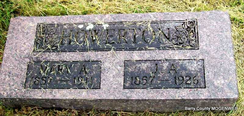 SSW: J. A. Howerton - Research Note: Stone was reported with the year of 1911 as the death date. Newspaper account gave Nov. 9, 1913 as the date of death. According to the paper Mary was a daughter of John and Emiline Stephens. - Cassville Republican, November 20, 1913 - We are sorry to chronicle the death of Mrs. J. A. Howerton which occurred at 1 o'clock, p.m., Nov. 9th. Her death was not unexpected from dropsy for the last 18 months and under the treatment of different physicians. She underwent many operations. Nothing seemed to do her much good. She bore her sickness with a fortitude almost beyond belief. Death was ultimately brought on by hemorrhage. She was in her right mind until the last moment and shook hands for the last time and was gone. Mary was the daughter of John and Emiline Stephens, deceased, and was 56 years old. She was born and raised in this part of the country and was united in marriage with Jno. A. Howerton in 1882. She professed faith in Christ and joined the Baptist church at the age of 15. Funeral services were conducted by Rev. J. T. Brattin and her remains were laid to rest in Clark Cemetery. | Headstone Online Obit DC Howerton Photo Darla Marbut |