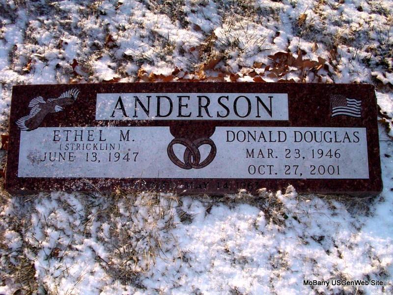 SSW: Ethel M. Anderson - Inscription: "Married May 14, 1967" - "SP 4 US ARMY, VIETNAM" - Research Note: Donald Douglas Anderson, 55, of Frontenac, Kansas, passed away at the Mt. Carmel Regional Medical Center Pittsburg, Kansas emergency room after a sudden illness. The son of Marshall and Millie (Dory) Anderson. He was a veteran of the Viet Nam War, serving in the U.S. Army. He married Ethel Stricklin May 14, 1967 at Plato, MO. | Obit Phyllis Long Photo Jay Trace |