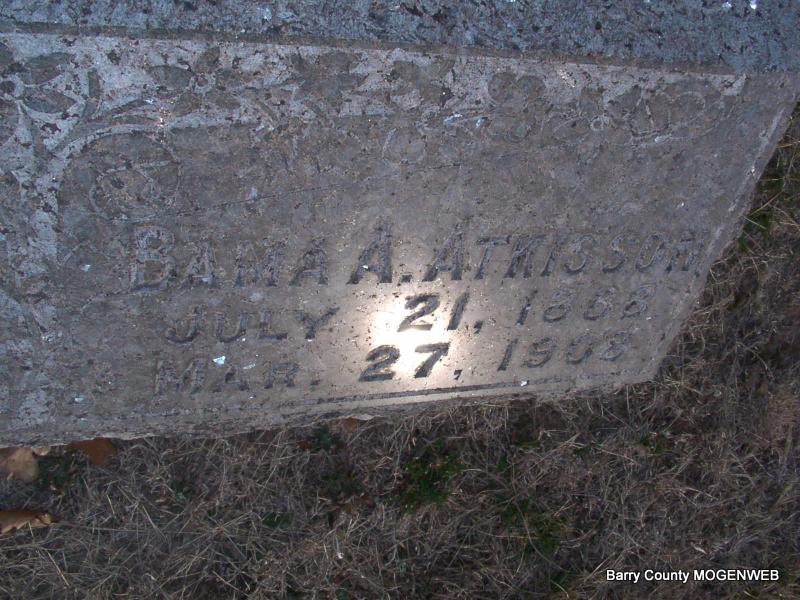 Research Note: She was listed as "Miss Banana Atkinson" in the King Funeral Home Records. The transcription states that she died of pneumonia. Order given by Marshall Atkisson on funeral plans. - Cassville Democrat, April 4, 1908 - Miss Bammie Atkisson Dies in Kansas City - Miss Alabama "Bammie" Atkisson's many young friends in Cassville were made very sad Saturday, when they learned by a telegram from E. A. Atkisson at Kansas City to his nephew, Robt. Atkisson of Cassville, that she died Friday evening, March 27, 1908, of an acute stomach trouble, after an illness of two months, age 19 years, 4 months and 6 days. The remains were shipped to Aurora, thence conveyed to the Clay Hill Cemetery near Madry, where they were laid to rest at 2 p.m. Sunday. Miss Bammie was the youngest daughter of the late Ex County Clerk Lafayette Atkisson of this county and Rachel Margaret Smith. She died at the home of her sister, Mrs. Fannie Stipp, who was unable to attend the funeral on account of sickness. Her brother, R. A. Atkisson of Claremore, Okla., accompanied the remains to Clay Hill Cemetery. | Headstone J. T. Mayes King Funeral Home Records Online Obit Photo Jay Trace |