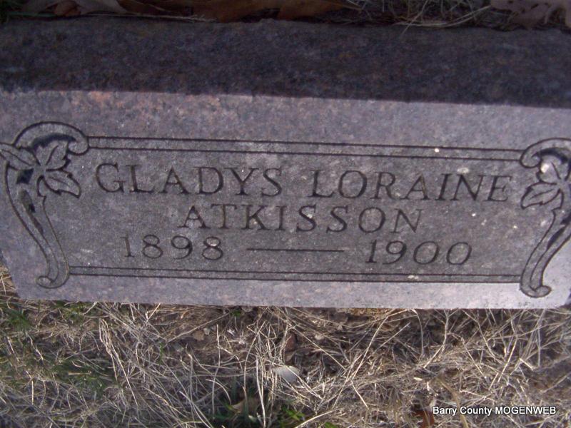 SSW: Henrietta - Research Note: His father was given as F. Lafayette Atkisson and mother as Rachel Smith, both born in MO. Cause of death hemorrhage of brain. Charged to Barry Co. Burial Association and Henrietta Atkisson, according to King Funeral Home records. - Cassville Republican, Sept. 1, 1892 - Ozark News: Born to Marshal Atkisson and wife, a boy. Marshal says he is a thoroughbred Republican. - Cassville Republican, Oct. 3, 1901 - Madry News: Born to Marshall Atkisson and wife on the 24th a fine girl. - Cassville Democrat, June 19, 1920 - Marshall Atkisson of Ozark township, accompanied by his brother, Robert Atkisson of Claremore, Okla., motored to this city, Wednesday. Robert renewed old acquaintances of many years standing. | Headstone J. T. Mayes Online Newspapers Phyllis Long King Funeral Home Photo Jay Trace |