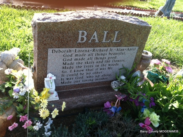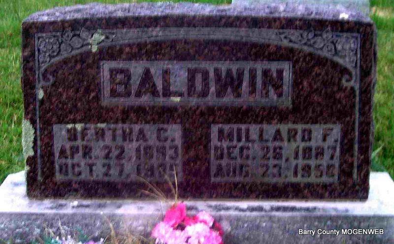 | BALDWIN, Bertha Catherine (TUNNELL) | Apr. 22, 1893 | Oct. 27, 1965 | SSW: Millard Frank - Research Note: Daughter of Thomas Miller Tunnell and Sarah Jane Berry. Bertha Tunnell married Frank Baldwin on Sept. 8, 1910 in Barry Co., MO. | Headstone J. T. Mayes MO Marriage Records Census Phyllis Long Photo Jay Trace |
