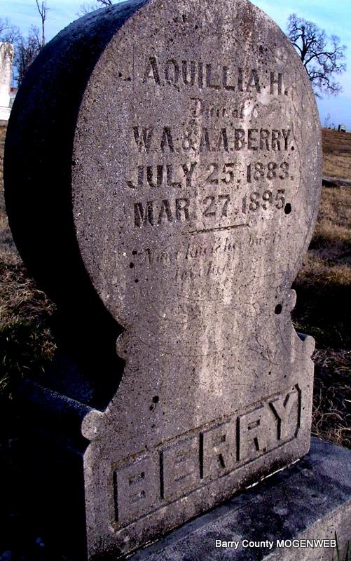 | BERRY, Aquillia H. | July 25, 1883 | Mar. 27, 1895 | Inscription: "Dau. of W. A. and A. A." | Headstone J. T. Mayes Photo Jay Trace |