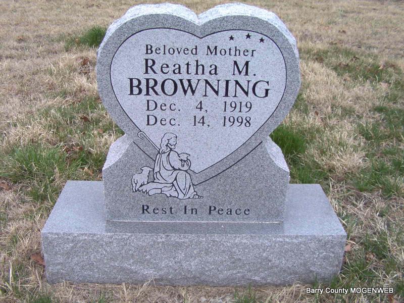 Dec. 14, 1998 | Inscription: "Beloved Mother, Rest in Peace" - Research Note: The Obit Daily Times Index at rootsweb.com gives Reatha M. Browning (Godsey), (Ellis), age 79, resident of Cassville, MO which agrees with the SSDI. The obit was in the Hutchinson News, Hutchinson, Reno Co., KS dated Dec. 18, 1998. MO Marriage Records have Bernard Ellis, age 19, married Reatha Godsey, age 17, on Nov. 23, 1937 in Mt. Vernon, Lawrence Co., MO. Montie Ellis, father of Bernard Ellis, and Mary Godsey, mother of Reatha Godsey, give their consent to this marriage. - 1940 Census, Ozark, Barry, Missouri - Reatha May Ellis is back home with her parents Lee and Mary Godsey, widowed (probably divorced), age 20, with son Donny Eugene Ellis, age 2 months. - Bernard Ellis born Aug. 10, 1918 is buried at Clay Hill. Died in 1977 and SSW Frank W. Ellis. | MO Marriage Records Census Phyllis Long Photo Jay Trace |