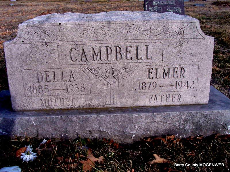 Aug. 27, 1938 | SSW: Elmer - Inscription: "Mother" - Research Note: Her father was James A. Lawson, born in TN and her mother was Alcy Malinda "Lindy" Rickman, born in MO. Della M. Lawson, age 19, married Elmer I. Campbell, age 25, on Mar. 16, 1904 in Aurora, Lawrence Co., MO. | Headstone J. T. Mayes Census MO Marriage Records Phyllis Long Photo Jay Trace |