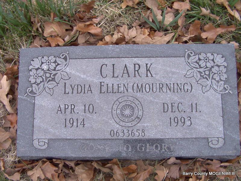 Inscription: "Gone to Glory" Daughters of the American Revolution" Symbol on stone, along with "DAR #0633658" - Research Note: Daughter of Ernest Samuel Mourning and Fannie Lane; widow of Walter Clark; she was a music teacher. The informant was her son, Glen. | Crafton Cantrell Funeral Home Connie Schmidt Photo Jay Trace |