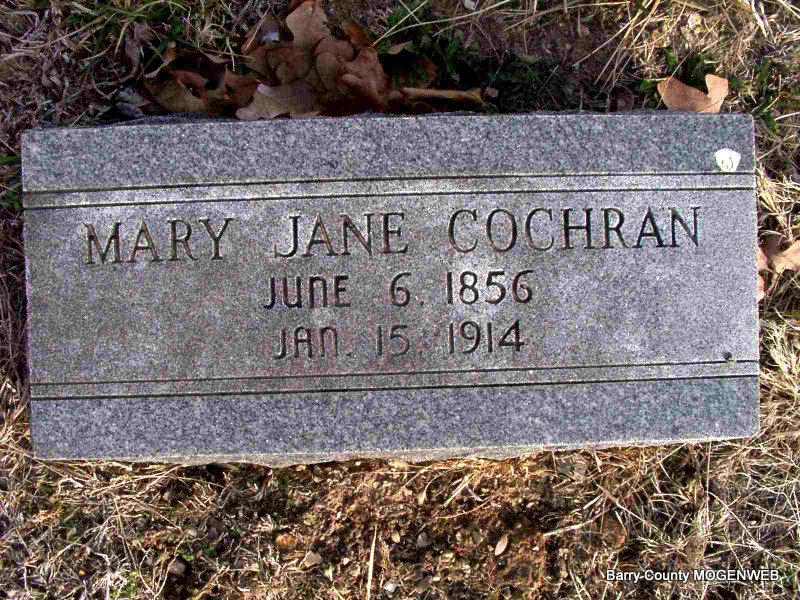 Research Note: Wife of Holden Jasper Cochran. - Mary J. Roark married Holden J. Cochran on Aug. 25, 1880 in Miller Co., MO. Researchers say she was the daughter of Joseph Roarke and Sarah C. Proctor. | Headstone J. T. Mayes MO Marriage Records Phyllis Long Photo Jay Trace |