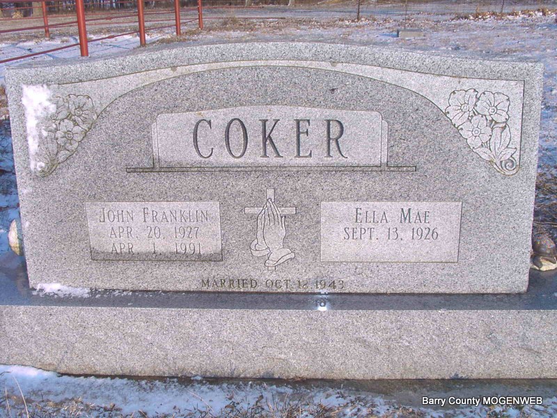 SSW: Ella Mae - Inscription: "Married Oct. 12, 1943" - Research Note: Aluminum plate at grave site refers to Mr. Coker as J. Frank. He was the son of Elijah Coker and Minnie Ethel Anderson; the husband of Ella Mae (Shoemaker) Coker; his occupation was a retired foreman tree trimmer for Shade Tree. He had resided in MO for his entire life. | Crafton Cantrell Funeral Home Connie Schmidt Photo Jay Trace |