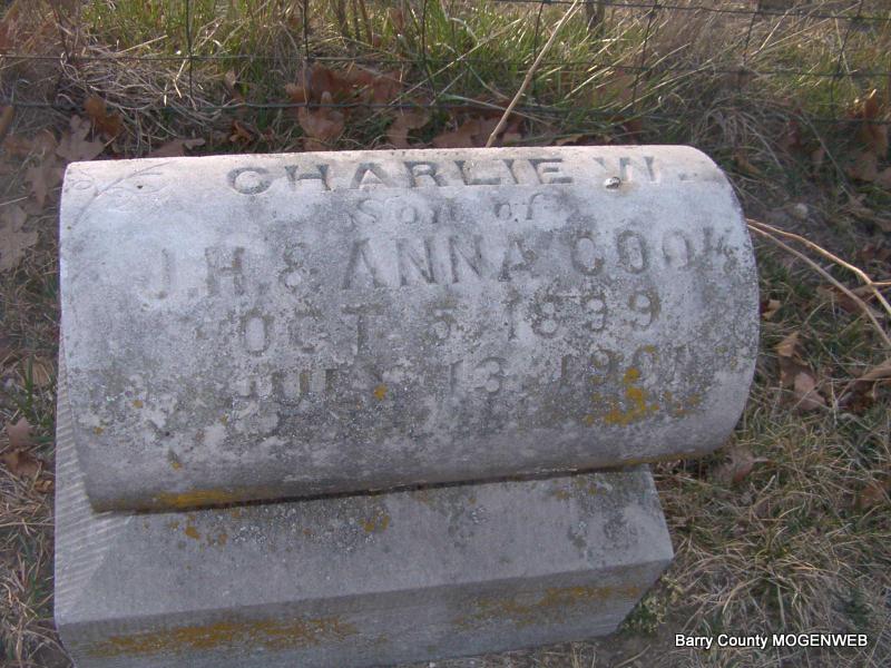 | COOK, Charlie W. | Oct. 5, 1899 | July 13, 1901 | Inscription: "Son of J. H. and Anna Cook" | Headstone J. T. Mayes Photo Jay Trace |