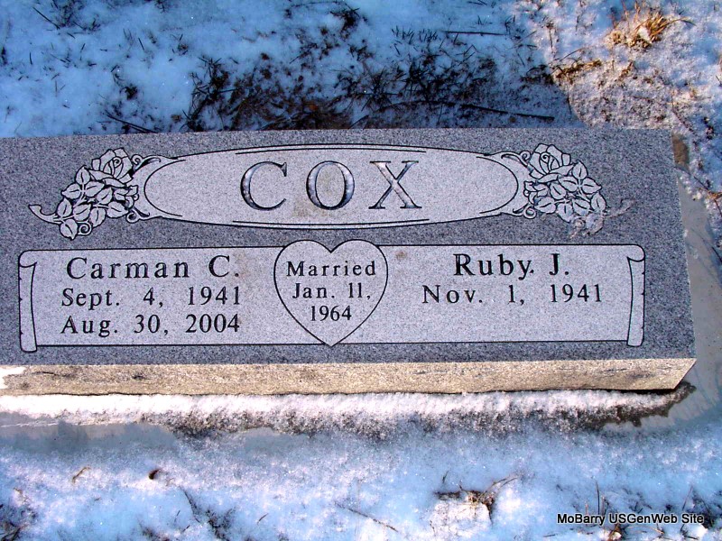 SSW: Ruby J. - Inscription: "Married Jan. 11, 1964" - Research Note: Monett Times - Carman Cox, 62, of Aurora, died August 30 at his home. Mr. Cox was born September 4, 1941, in Crane. He was a retired laborer. His wife, Ruby Cox, survives. Additional survivors include one son, Kenneth Cox of Aurora; two daughters, Barbara Cox of Aurora and Janet Yipe of the state of Kansas; three brothers, Howard Cox of Mt. Vernon, Chester Cox of Ozark, and Cledus Cox of London, Arkansas; three sisters, Nola Harris and Frances Gryder, both of Aurora, and Opal Gryder of Cassville; two grandchildren and one great grandchild. Graveside services will be 11 a.m. tomorrow, September 2, at Clay Hill Cemetery under the direction of Peterson Funeral Home of Aurora. Visitation will be 7 to 8 p.m. today, September 1, at the funeral home. | Photo Jay Trace Monett Times Donna Cooper |