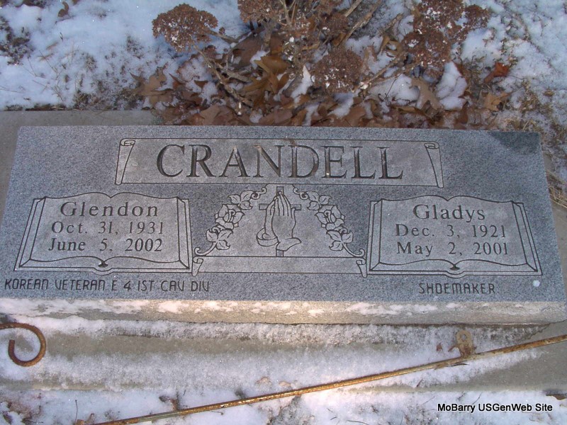 SSW: Gladys - Inscription: "Korean Veteran E 4 1st Cav Div" - Research Note: Monett Times, Glendon Crandell, 70, of Aurora, died Wednesday, June 5, at the Aurora Nursing Center. He was a retired electrician. Graveside services were held at 10:30 a.m. today, June 7, in Clay Hill Cemetery under the direction of Peterson Funeral Home of Aurora. | Photo Jay Trace Monett Times Donna Cooper |