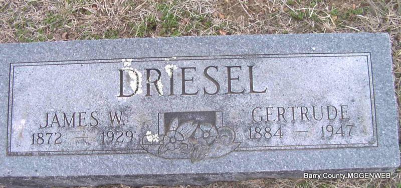 SSW: Gertrude - Research Note: Stone reads born 1872, but he was born Jan. 1, 1871 and he died June 19, 1929, of dropsy according to King Funeral Home records. Son of Frederick W. Driesel and Martha Longwell. | Headstone J. T. Mayes Census Phyllis Long King Funeral Home Photo Jay Trace |