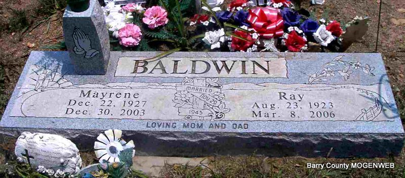 SSW: Ray Baldwin - Inscription: "Loving Mom and Dad" "Married Nov. 29, 1945" - Research Note: Mayrene Baldwin, 76, of Verona, died December 30 at St. Johns Regional Health Care Center in Springfield. Mrs. Baldwin was a retired garment factory worker. Daughter of Herman Lansdown and Margery McNeill; married Cecil Ray Baldwin November 29, 1945. | Monett Times Phyllis Long Photo Jay Trace |