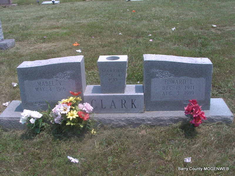 SSW: Edward L. - Inscription: "Married Dec. 4, 1933" - Research Note: She was the daughter of Silvester and Nellie (Jennings) Hudson. On December 4, 1933, she married Edward Loren Clark in Cassville, Missouri, and he preceded her in death on August 3, 1989. Her parents, daughter Shirley Tate, two sons, Thomas and Rex Dale Clark, one stepbrother and two stepsisters also preceded her in death. - Another Photo | Lawrence Co. Record Phyllis Long Photos Jay Trace |