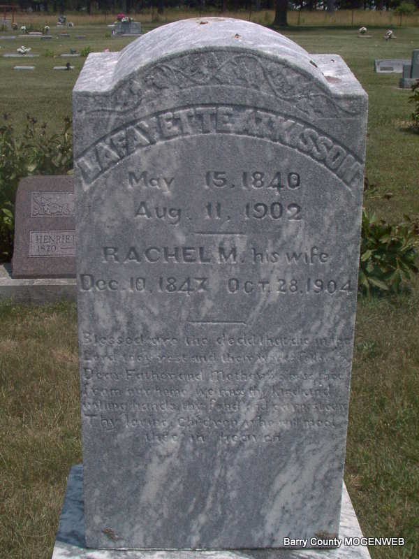 | ATKISSON, Lafayette | May 15, 1840 | Aug. 11, 1902 | SSW: Rachel M. - Research Note: Lafayette Atkisson's year of birth 1840 on stone. - Inscription: "Blessed Are The Dead That Die In The Lord, They Rest And Their Works Follow. Dear Father And Mother We Miss Thee From Our Home, We Miss Thy Kind And Willing Hands, Thy Fond And Earnest Care, Thy Loving Children Who Will Meet Thee In Heaven". - Research Note: Eric's notes from findagrave.com: Born in Illinois or Missouri, Lafayette was the eldest child of Benjamin Atkisson and Mary Catherine Kirk. His father was born in Tennessee, it is believed, to a William and Annie Atkisson of Goochland County, Virginia, and migrated to Greene County, Missouri from Hawkins County, Tennessee in the early or mid-1840s. During the Civil War Lafayette enlisted as a private in Company K, 46th Missouri Infantry Regiment and mustered out as a corporal. On February 11, 1866 in Barry County he married Rachel Margaret Smith and they had nine children of record: Francis, Fannie, Albert, Marshall, Ida, Robert, William, Claud, and Bama. | Headstone J. T. Mayes Note Phyllis Long Photo Jay Trace |