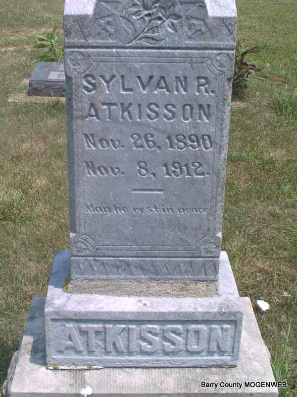 Inscription: "May He Rest In Peace" - Research Note: He was single and died following an operation for appendicitis. He was a son of Albert Atkisson and Dora Black, both born MO. Informant was Albert W. Black. - Obit reads that he was a son of Mrs. W. H. Suttles of Monett. Sylvan was the stepson of W. H. Suttles. Dora (Black) Atkisson married William H. Suttles on Jan. 21, 1894 in Barry Co., MO. - Cassville Republican, Thursday, November 14, 1912 - Silvan Atkisson died Friday afternoon at 5:30 o'clock at the Burge Deaconess hospital in Springfield following an operation for appendicitis. He lived only a short time after the operation was performed. His body was brought to Monett, Saturday, and buried at the Clay Hill Cemetery near Madry, Sunday afternoon in the presences of a large number of friends and relatives. Silvan was the son of Mrs. W. H. Suttles of Monett and was born on a farm near Madry about 23 years ago. He had spent most of his life in Cassville where he was held in high esteem. He was a young man of industry and of a generous impulse. His many friends here were grieved to learn of his death. He leaves a mother, two brothers, two sisters and a number of relatives and friends to mourn his loss. | Headstone J. T. Mayes Online Obit Death Certificate Phyllis Long Photo Jay Trace |