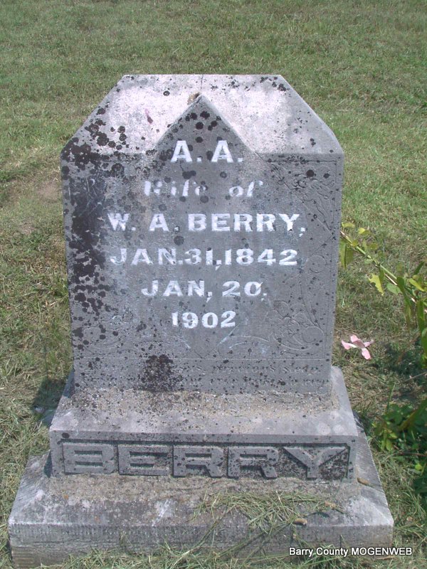 | BERRY, A. A. | Jan. 31, 1842 | Jan. 20, 1902 | Inscription: Wife of W. A. - Research Note: Wife of William Anderson Berry. Researchers say Alvira (Schauss) Berry was the daughter of Jacob Schauss and Rebecca Griegg. No proof. | Headstone J. T. Mayes Note Phyllis Long Photo Jay Trace |