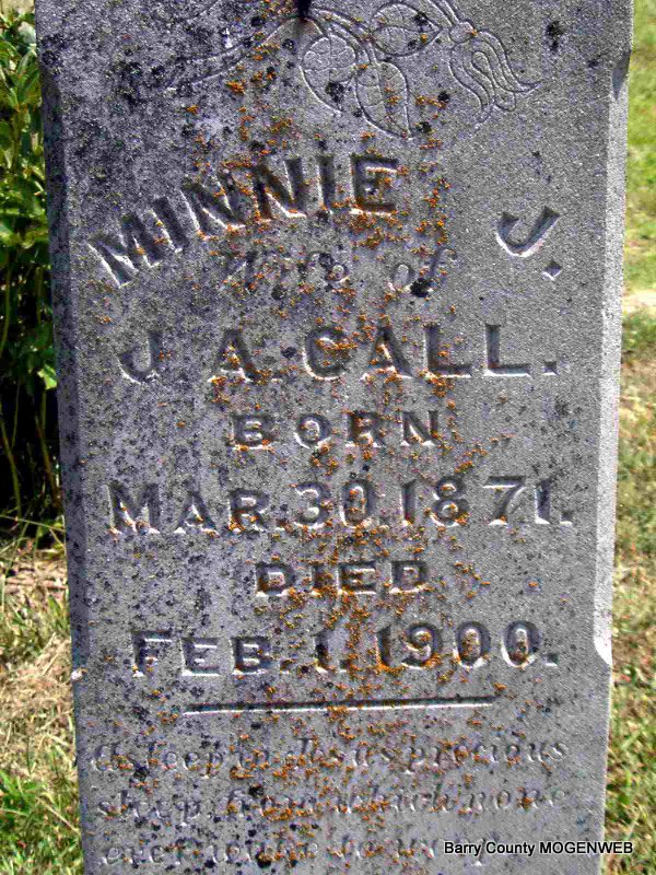 | CALL, Minnie J. (ELLIS) (EAGLE) | Mar. 30, 1871 | Feb. 1, 1900 | Inscription: "Wife of J. A." - "Asleep In Jesus Precious Sleep From Which None Ever Wake To Weep." - Research Note: Other researchers say that Minnie Ellis first married Elisha Eagle on Dec. 26, 1886 in Barry Co., MO and I find this in the MO Marriage Records. - Also, Minnie Ellis, age 25, married James A. Call, age 25, on Apr. 5, 1896 in Barry Co., MO. Daughter of Perry S. Ellis and Sarah F. Lemaster. | Headstone J. T. Mayes Census MO Marriage Records Phyllis Long Photo Jay Trace |