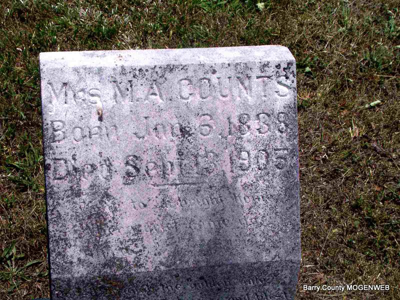| COUNTS, Margaret Angeline (ELLIS) (WOOLSEY) | Jan. 6, 1838 | Sept. 13, 1905 | Inscription: "Gone To A Bright Home Where Grief Comes No More, Passed Through The Golden Gate To Dwell With A Happy And Blest' By Maud LeMaster" - Research Note: poem doesn't seem to be complete. This one was first recorded as Mrs. M. A. Combs by J. T. Mayes. Stone reads Mrs. M. A. Counts. Died a widow of tuberculosis. Listed as Margaret Ann Counts according to King Funeral Home Records - Jim's Note: The stone reads Mrs. M. A. Counts. From the research I have done this stone is for Margaret Angeline Ellis, daughter of Ezekial Ellis and Margaret Ann Mackey. She first married John Woolsey Aug. 13, 1859 in McMinn County, TN and had two children with him: Ezekial, b ca 1862 and Dicy Jane, born Feb. 1863, both in Tennessee. Dicy Jane married Nelson G. Lemaster May 23, 1883 in Lawrence Co., MO and in the 1900 census they had 5 children. Margaret A. Woolsey married James M. Counts, Aug. 14, 1881, in Lawrence Co., MO. In the 1900 census she was a widow, living in Aurora Township. Jim reported a birth date of Jan. 6, 1837. | Headstone J. T. Mayes Census Jim Wilson King Funeral Home Photo Jay Trace |