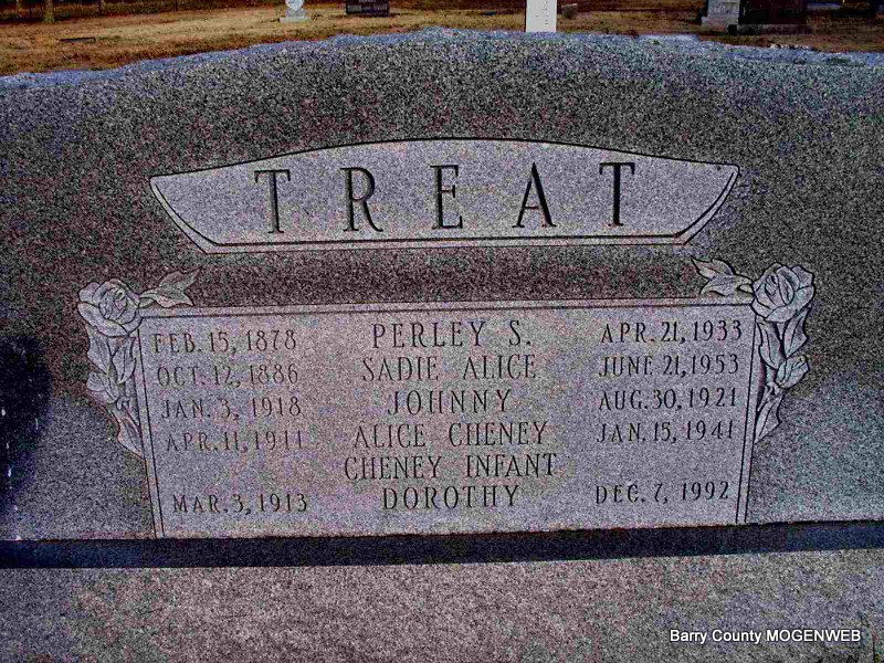Jan. 15, 1941 | SSW: Perley S., Johnny, Alice Cheney, Cheney infant, and Dorothy - Research Note: new stone. Previous entry has name as Chaney, funeral home has Chaney and year of birth as 1911. Father was given as Pearley S. Treat, and mother as Sadie Alice Hamble, both born in IL. Died of chronic myocarditis. Charged to Barry Co. Burial Association. Order given by William Treat according to King Funeral Home records. - Husband was Willis Cheney. - 1920 Census, Ozark, Barry, Missouri - Alice Treat, age 7, born, IL, is at home with her parents Pearly and Sadie Treat. - 1930 Census, Ozark, Barry, Missouri - Alice is married but living at home with her parents Pearly and Sadie, with a daughter Pearl Cheney, age 1. - 1940 Census, Carrollton, Carroll, Missouri - Pearl Cheney, age 11, born MO, is a ward for the State Home for Neglected and Dependent Children. | King Funeral Home Census Phyllis Long Photo Jay Trace |