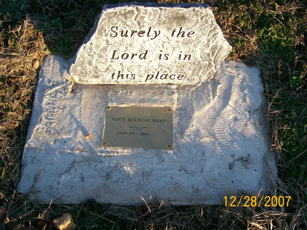 | HARRIS, Nancy (MCCLELLAN) | 1851 | No Date | Research Note: Wife of Daniel Harris. Still living in the 1900 census. | Headstone J. T. Mayes Census Phyllis Long Photo Jay Trace |