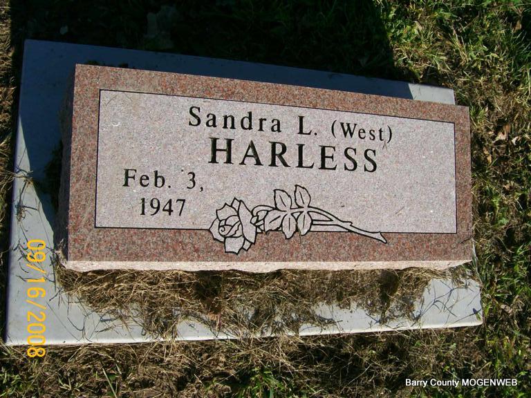 | HARLESS, Sandra L. (WEST) | Feb. 3, 1947 | No Date | No Data | Headstone J. T. Mayes Photo Jay Trace |