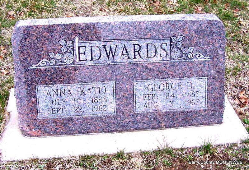 | EDWARDS, Anne "Kate" (BALDWIN) | July 10, 1893 | Sept. 22, 1962 | SSW: George D. Edwards - Research Note: March 20, 1913, Cassville Republican - Licenses to Wed: George D. Edwards, 26, Monett and Anna C. Baldwin, 19, McDowell. - Anna C. Baldwin, age 19, married George D. Edwards, age 26 on Mar. 16, 1913 in Barry Co., MO. Daughter of Andrew Baker Baldwin and Martha Elizabeth Fields, both buried at Clay Hill Cemetery. | Headstone J. T. Mayes Online Newspapers MO Marriage Records Census Phyllis Long Photo Jay Trace |