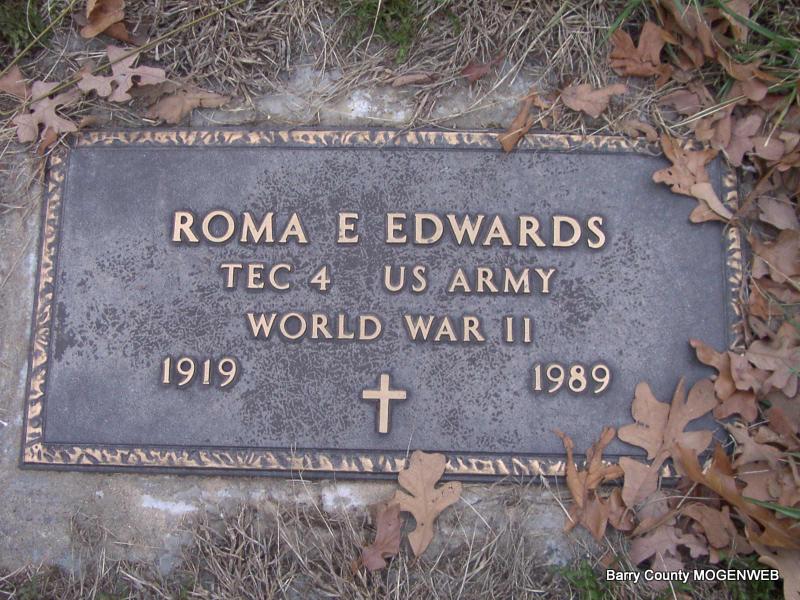 | EDWARDS, Roma E. | Dec. 20, 1919 | Jan. 11, 1989 | Inscription: "Gone But Not Forgotten" - Research Note: Son of George D. Edwards and Anne Baldwin. - Military Stone - Inscription: "Tec 4 US Army, WW II" | Census Phyllis Long Photos Jay Trace |