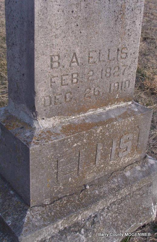 Research Note: His name was Benjamin Abbot Ellis, and according to the King Funeral Home Records, he died Dec. 26, 1909, stone reads that he died in 1910. Died of senility at age 82 years, 10 months, 24 days. - Notes of June Wilson Weaver at findagrave.com: Benjamin A. Ellis was the son of Ezekiel B. and Margaret "Peggy" (Mackey) Ellis. He was married 7 August 1848, McMinn County, Tennessee, to Mary Ann "Polly" Maples, daughter of Josiah Maples, Jr. On 16 June 1864, Barry County, Missouri, he was married to Mary Ann (Parker) McCoy. Mary Ann Parker was previously married to Enoch McCoy and had two children by him. | Headstone J. T. Mayes Note Phyllis Long Photo Jay Trace |