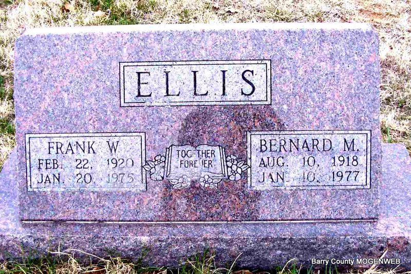 | ELLIS, Bernard M. | Aug. 10, 1918 | Jan. 10, 1977 | SSW: Frank W. Ellis - Inscription: "Together Forever" - Research Note: Son of Montie Ellis and Minnie Means. Frank W. Ellis was his brother. He was married to Reatha Godsey. MO Marriage Records have Bernard Ellis, age 19, married Reatha Godsey, age 17, on Nov. 23, 1937 in Mt. Vernon, Lawrence Co., MO. Montie Ellis, father of Bernard Ellis, and Mary Godsey, mother of Reatha Godsey, give their consent to this marriage. - 1940 Census, Ozark, Barry, Missouri - Reatha May Ellis is back home with her parents Lee and Mary Godsey, widowed (probably divorced), age 20, with son Donny Eugene Ellis, age 2 months. Reatha is buried at Clay Hill Cemetery under Reatha May Browning. Son, Donny, is buried at Clay Hill on this page. | Headstone J. T. Mayes MO Marriage Records Census Phyllis Long Photo Jay Trace |