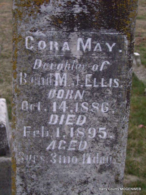 | ELLIS, Cora May | Oct. 14, 1866 | Feb. 1, 1895 | Inscription: "Aged 8 yrs, 3 mos., 17 days" - " Daughter of B. and M. J. Ellis" - Research Note: Daughter of Benjamin Ellis and Martha Short. She died the same day as her father. | Headstone J. T. Mayes Note Phyllis Long Photo Jay Trace |